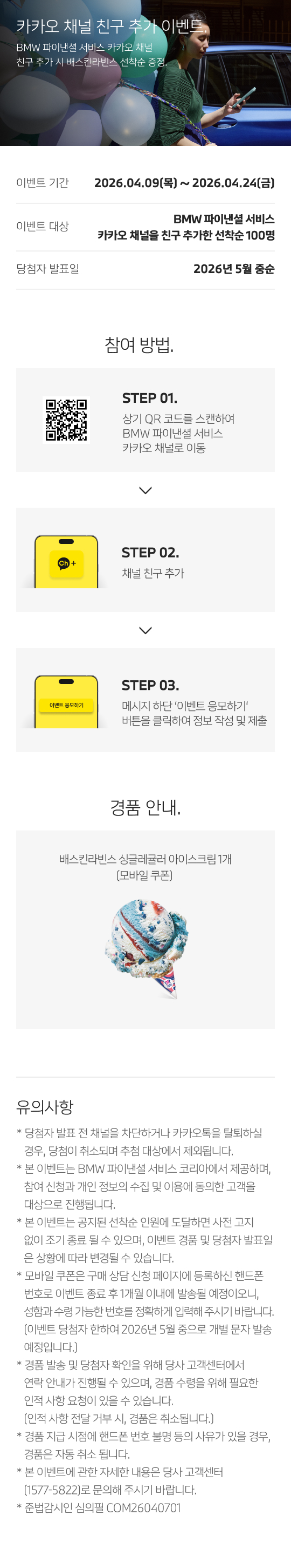 BMW 파이낸셜 서비스 카카오 채널 친구 추가 시 배스킨라빈스 선착순 증정.